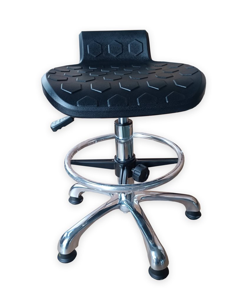 Pracovní židle se sedákem a opěrákem z PUR pěny splňující normy pro antistatické prostředí s robustním křížem z hliníku. Židle s kruhovou podpěrou pro nohy, kluzáky pro zajištění stability a bezpečnosti s nosností 130 kg.