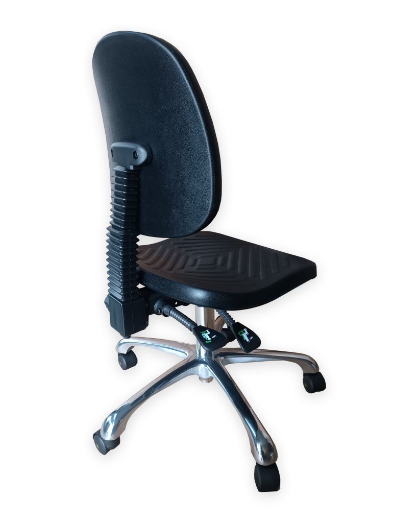 Pracovní židle se sedákem a opěrákem z PUR pěny splňující normy pro antistatické prostředí s robustním křížem z hliníku. Židle s kruhovou podpěrou pro nohy, kluzáky pro zajištění stability a bezpečnosti s nosností 130 kg.