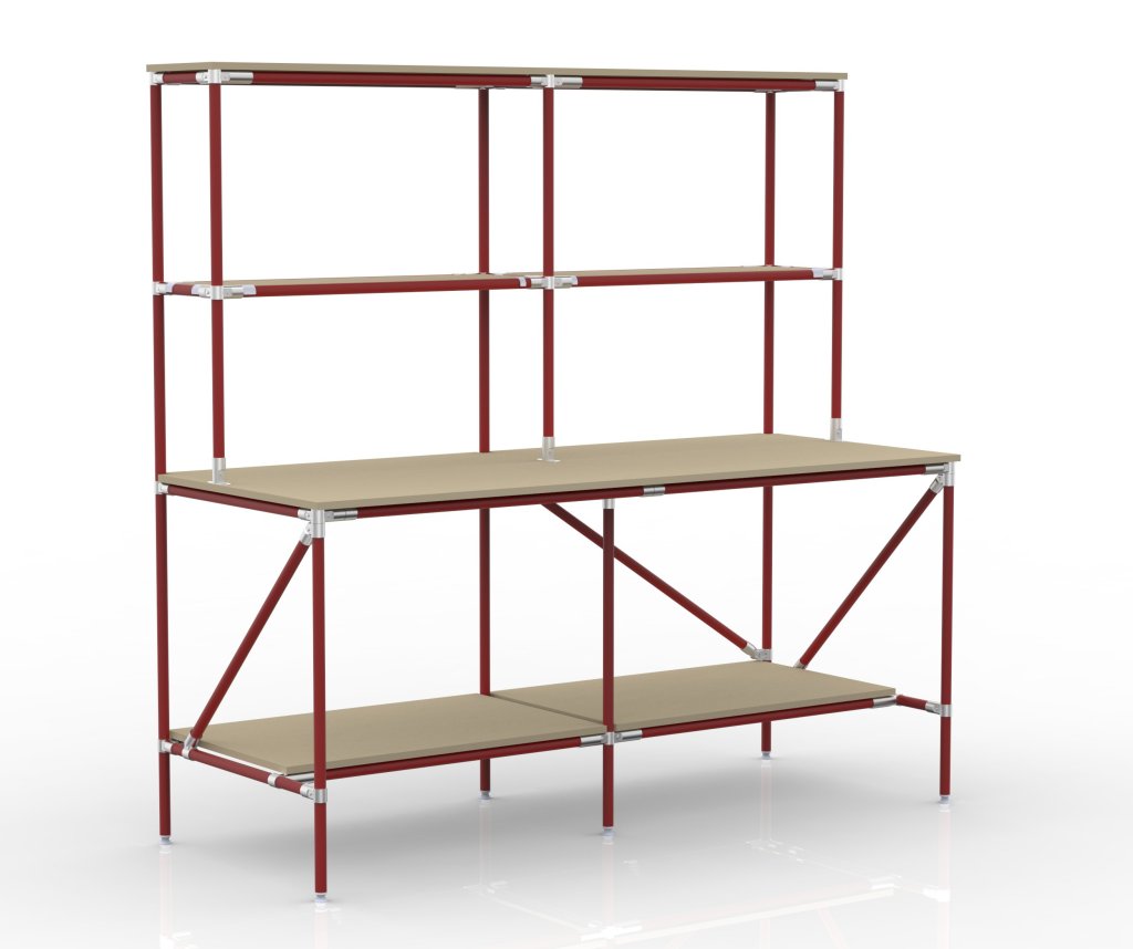 Ekonomický a flexibilní balicí stůl s odkládacím prostorem z trubkového stavebnicového systému. Pracovní deska a police jsou vyrobeny z dřevotřísky o tloušťce 18 mm. Rozměry konstrukce 1970 x 2000 x 800 mm. Celková nosnost dosahuje 350 kg, s nosností jednotlivého patra až 100 kg.
