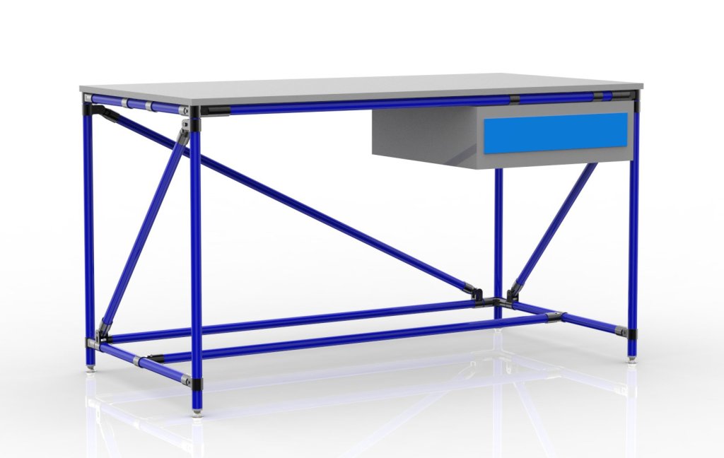 Dílenský stůl z trubkového stavebnicového systému. Součástí stolu je oboustranně laminovaná pracovní deska, stolový kontejner se zásuvkou a čtyři stavitelné nožičky. Nosnost při rovnoměrném zatížení 100 kg. Rozměry 850 x 1500 x 750 mm.
