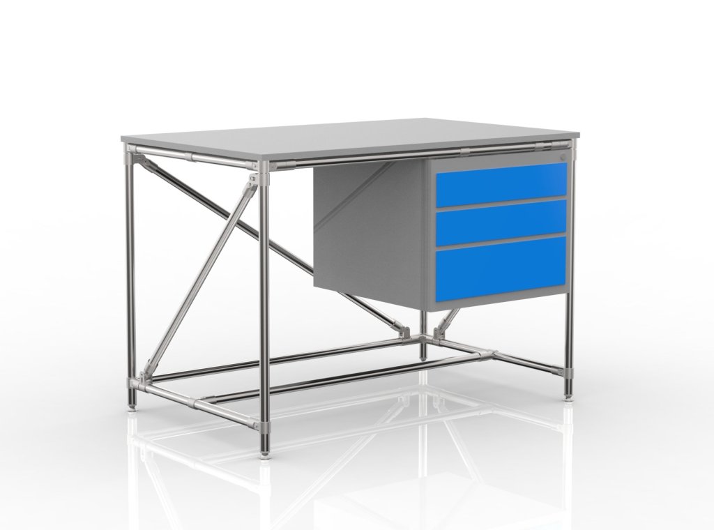 Dílenský stůl z trubkového stavebnicového systému s pracovní lamino deskou tloušťky 18 mm, stolovým kontejnerem se třemi zásuvkami a čtyřmi stavitelnými nožičkami. Nosnost při rovnoměrném zatížení 100 kg. Rozměry 850 x 1200 x 750 mm.
