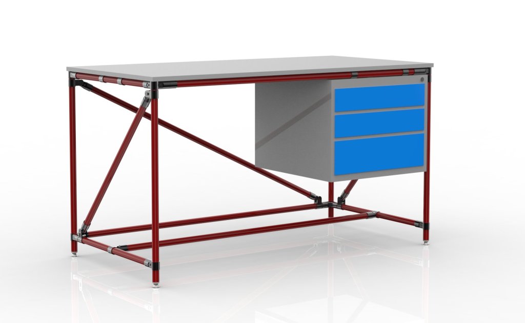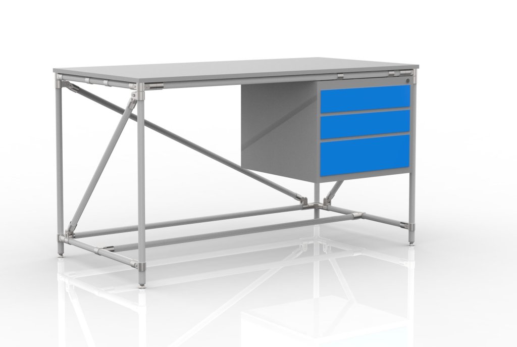 Dílenský stůl z trubkového stavebnicového systému s pracovní lamino deskou tloušťky 18 mm, stolovým kontejnerem se třemi zásuvkami a čtyřmi stavitelnými nožičkami. Stůl poskytuje dostatek prostoru pro kompletaci a balení objednávek apod. Nosnost při rovnoměrném zatížení 100 kg. Rozměry 850 x 1500 x 750 mm.