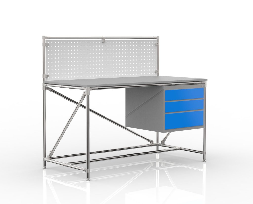 Dílenský stůl s perfopanelem z trubkového stavebnicového systému. Součástí stolu je dřevotřísková pracovní deska oboustranně laminovaná tloušťky 18 mm, stolový kontejner se třemi zásuvkami, perfopanel pro zavěšení nářadí či boxů a čtyři stavitelné nožičky. Nosnost při rovnoměrném zatížení 100 kg. Rozměry 1282 x 1500 x 750 mm.