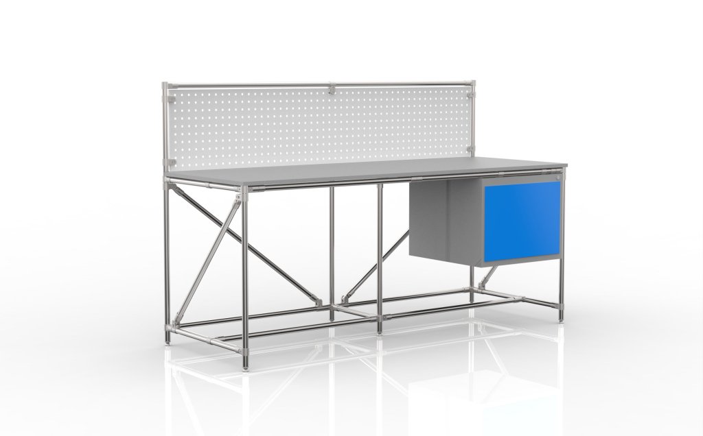 Dílenský stůl z trubkového stavebnicového systému. Součástí stolu je dřevotřísková pracovní deska oboustranně laminovaná tloušťky 18 mm, stolový kontejner, perfopanel pro zavěšení nářadí či boxů a čtyři stavitelné nožičky. Nosnost při rovnoměrném zatížení 100 kg. Rozměry 1282 x 2000 x 750 mm.