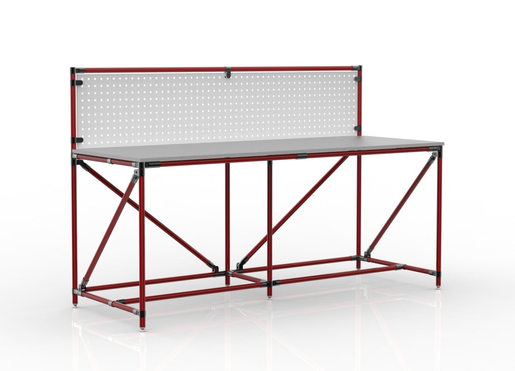 Dílenský stůl s perfopanelem z trubkového stavebnicového systému. Součástí stolu je dřevotřísková pracovní deska oboustranně laminovaná tloušťky 18 mm, perfopanel pro zavěšení nářadí či boxů a čtyři stavitelné nožičky. Nosnost při rovnoměrném zatížení 100 kg. Rozměry 1282 x 2000 x 750 mm.