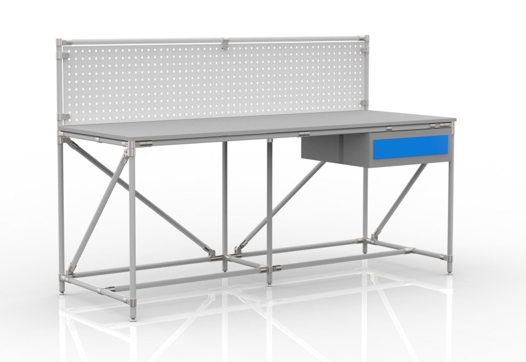 Dílenský stůl s perfopanelem z trubkového stavebnicového systému. Součástí stolu je dřevotřísková pracovní deska oboustranně laminovaná tloušťky 18 mm, stolový kontejner se třemi zásuvkami, perfopanel pro zavěšení nářadí či boxů a čtyři stavitelné nožičky. Nosnost při rovnoměrném zatížení 100 kg. Rozměry 1282 x 2000 x 750 mm.