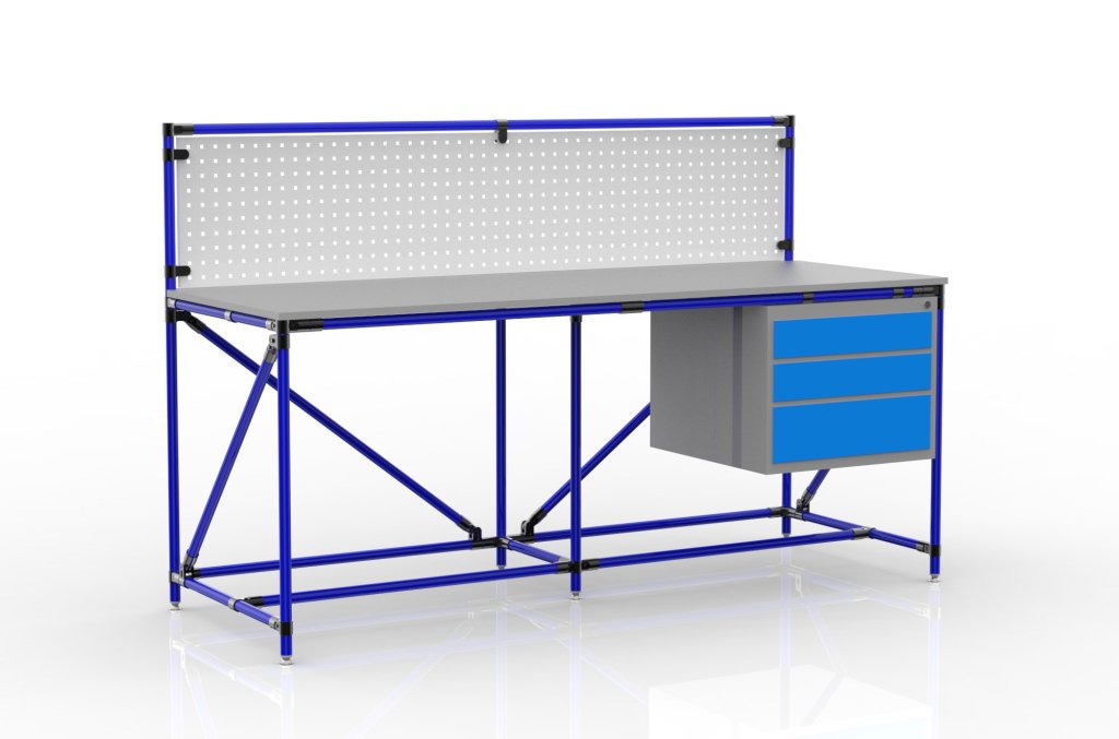 Dílenský stůl s perfopanelem z trubkového stavebnicového systému. Součástí stolu je dřevotřísková pracovní deska oboustranně laminovaná tloušťky 18 mm, stolový kontejner se třemi zásuvkami, perfopanel pro zavěšení nářadí či boxů a čtyři stavitelné nožičky. Nosnost při rovnoměrném zatížení 100 kg. Rozměry 1282 x 2000 x 750 mm.