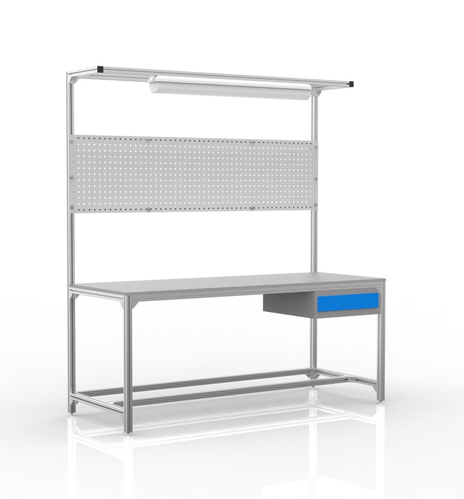 Dílenský stůl z hlinikových profilů. Součástí stolu je lamino deska, stolový kontejner s jednou zásuvkou, perfopanel pro zavěšení celý popis a parametry