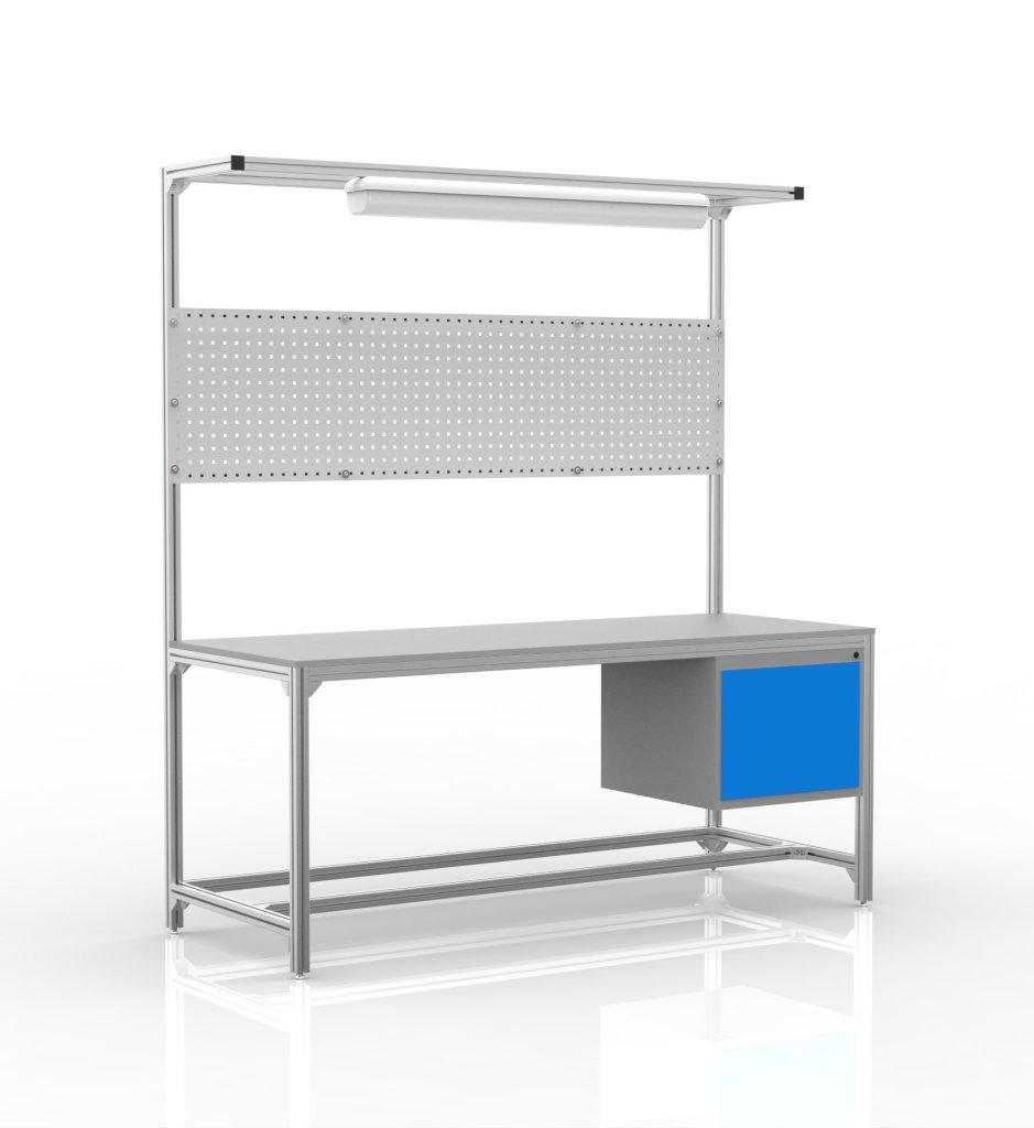 Dílenský stůl z hlinikových profilů. Součástí stolu je lamino deska, stolový kontejner se dvěma zásuvkami, perfopanel pro zavěšení boxů či nářadí, LED osvětlení a výškově stavitelné nožičky. Díky použití hliníkových profilů je stůl lehký, ale zároveň vysoce pevný. Nosnost při rovnoměrném zatížení 500 kg. Rozměry 2200 x 1200 x 790 mm.