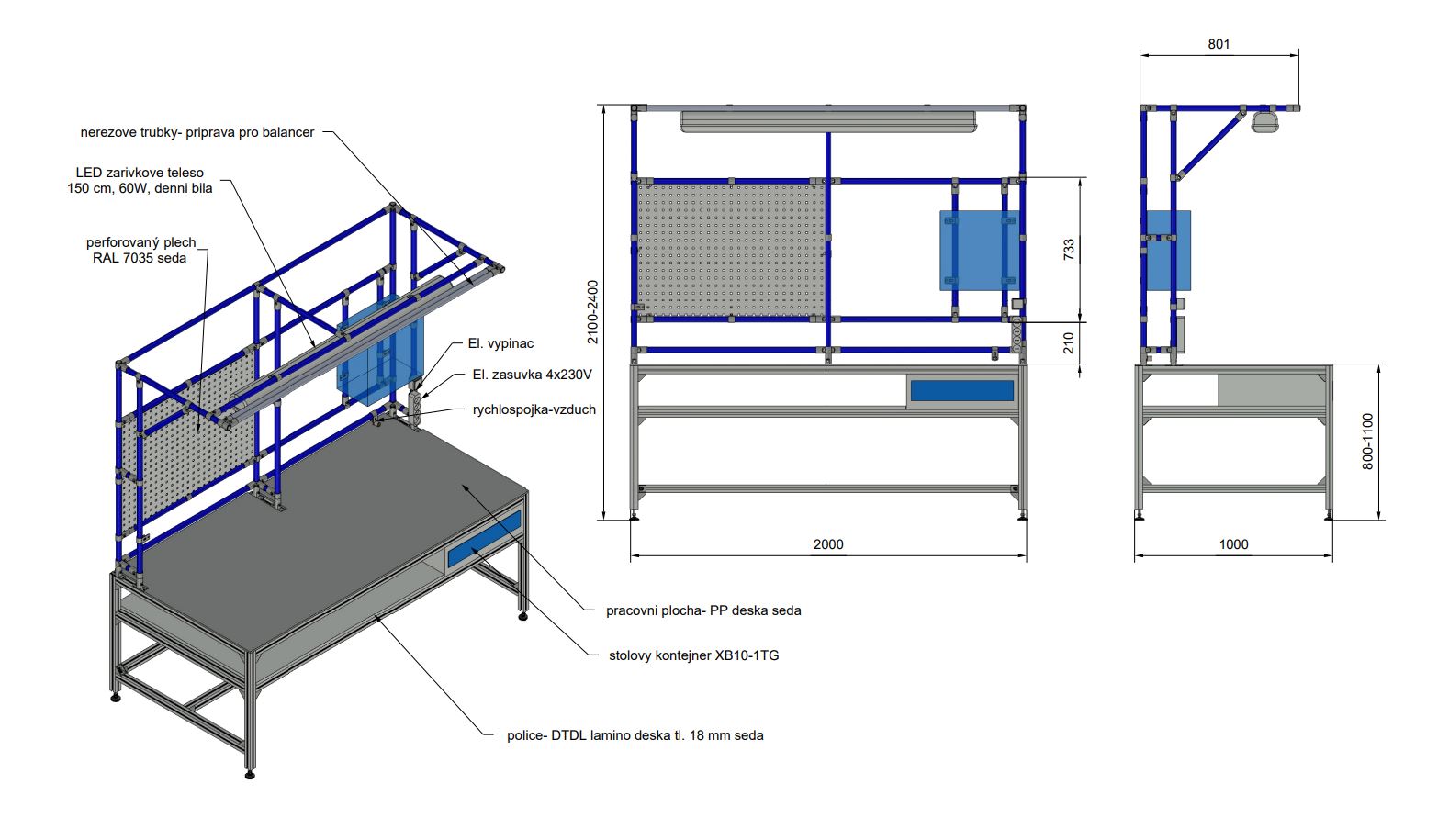 Dílenský stůl z hlinikových profilů s kontejnerem a s nástavbou z trubkového systému nabízí přehledné uspořádání pracovního celý popis a parametry