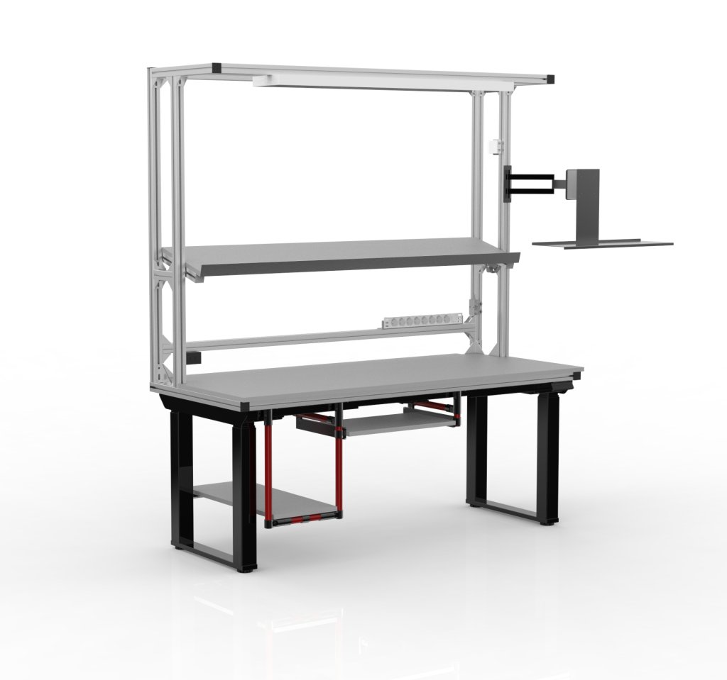 Elektricky výškově stavitelný pracovní stůl s nástavbou z hliníkových profilů. Součástí stolu je pracovní lamino deska tloušťky 18 mm, dvě podvěsné police, držák na monitor a klávesnici, nastavitelná police se zarážkou proti přepadnutí, LED osvětlení. Výška pracovní plochy nastavitelná v rozmezí 717 - 1367 mm. Celková nosnost při rovnoměrném zatížení je 200 kg, nosnost police 50 kg, nosnost pracovní plochy 150 kg. Rozměry 2000 - 2650 x 1750 x 750 mm.