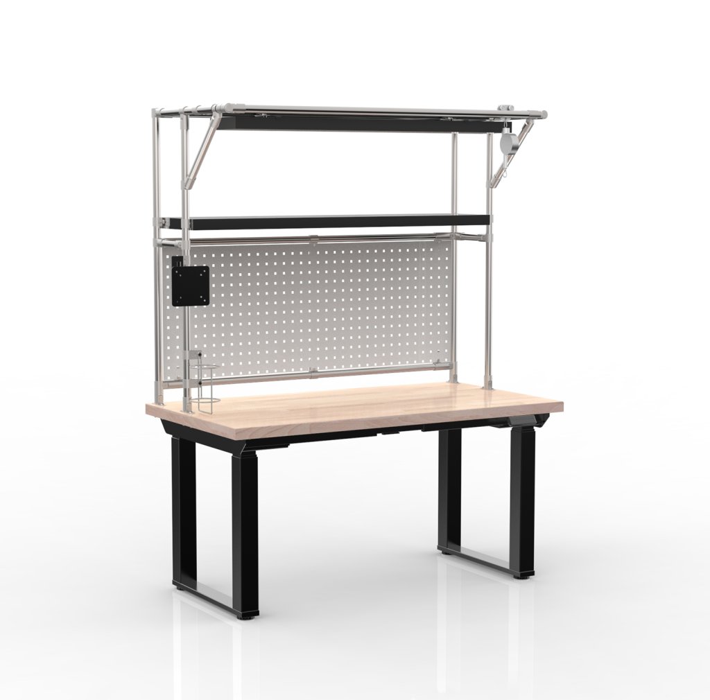 Elektricky výškově stavitelný pracovní stůl s pracovní deskou z bukové spárovky, součástí stolu je perfopanel pro zavěšení boxů či celý popis a parametry