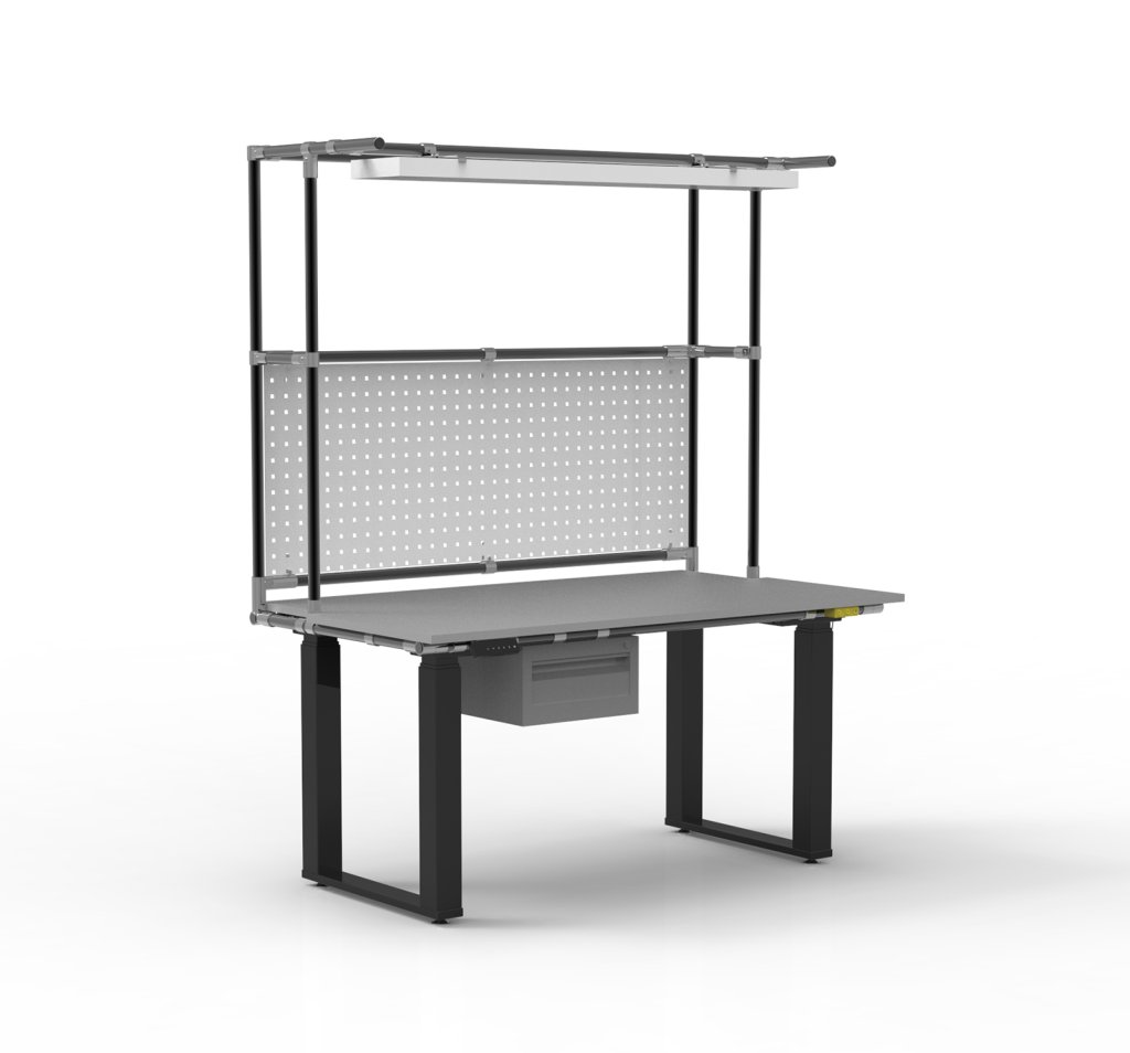 Ergonomický ESD stůl pro elektrostaticky chráněná pracoviště s praktickou nástavbou z trubkového systému. Součástí stolu je LED osvětlení, perfopanel a kontejner s jednou zásuvkou. Stůl je vybaven intuitivním ovladačem s možností uložení tří přednastavených výšek, což usnadňuje ergonomické nastavení pracovní plochy v rozmezí 680 – 1330 mm.