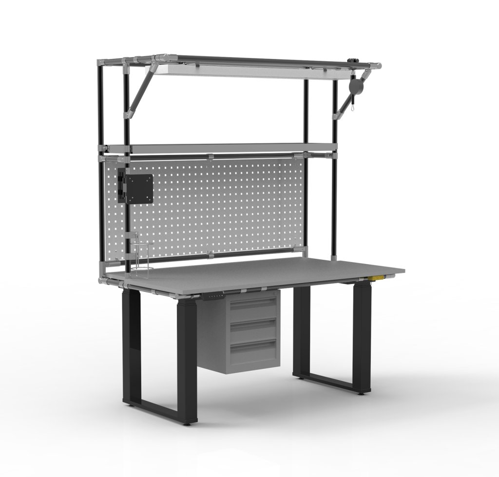 Ergonomický ESD stůl pro elektrostaticky chráněná pracoviště s praktickou nástavbou z trubkového systému. Součástí stolu je pozinkovaná police, LED osvětlení, perfopanel, držák na monitor, držák na 2l PET láhev a kontejner se třemi zásuvkami. Stůl je vybaven intuitivním ovladačem s možností uložení tří přednastavených výšek, což usnadňuje ergonomické nastavení pracovní plochy v rozmezí 680 – 1330 mm.