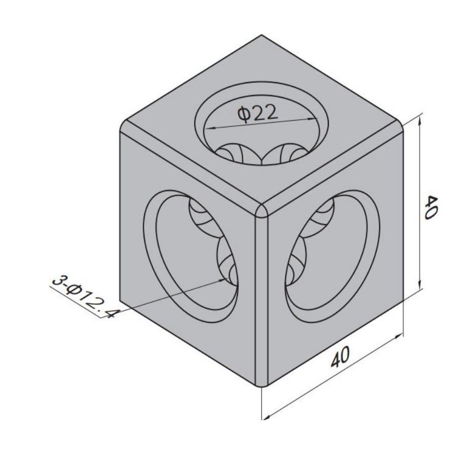Krychlová spojka pro pravoúhlé spojení 3 hliníkových profilů. Rozměry 40x40x40 mm. celý popis a parametry
