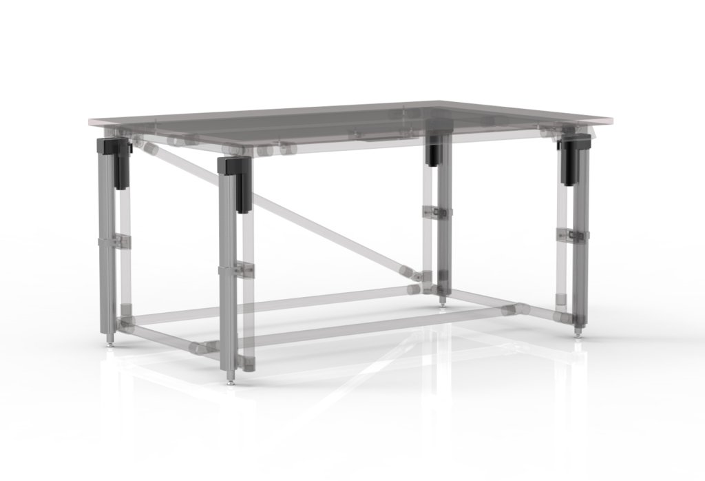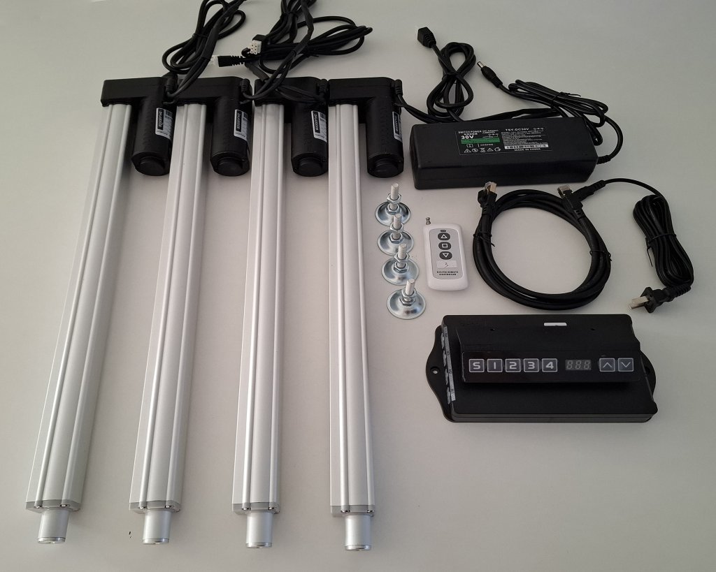 Elektrický lineární pohon napájený napětím 24V. Zvedací kapacita pohonu je 3000 N. Maximální výsuv zařízení je 45 cm. LEG_SET 4 obsahuje 4 nohy, ovládání, dálkové ovládání, napájení, stavěcí šrouby, napájecí kabely.