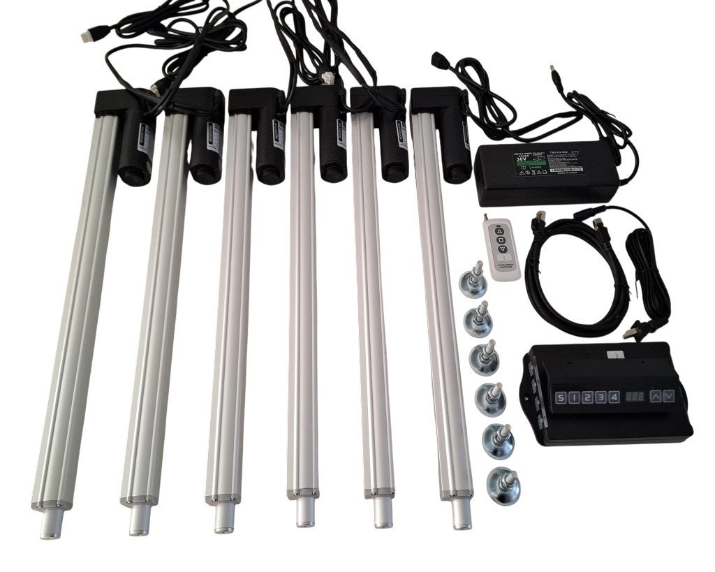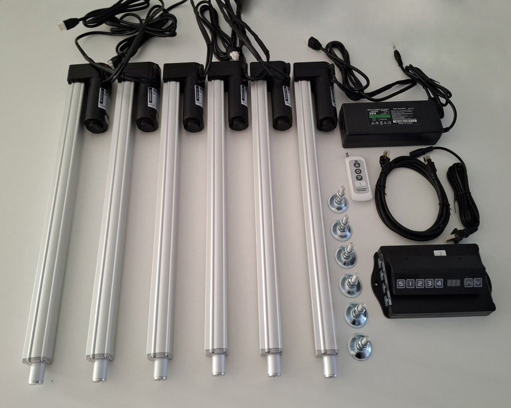 Elektrický lineární pohon napájený napětím 24V. Zvedací kapacita pohonu je 3000 N. Maximální výsuv zařízení je 45 cm. LEG_SET 6 obsahuje 6 nohou, ovládání, dálkové ovládání, napájení, stavěcí šrouby, napájecí kabely.
