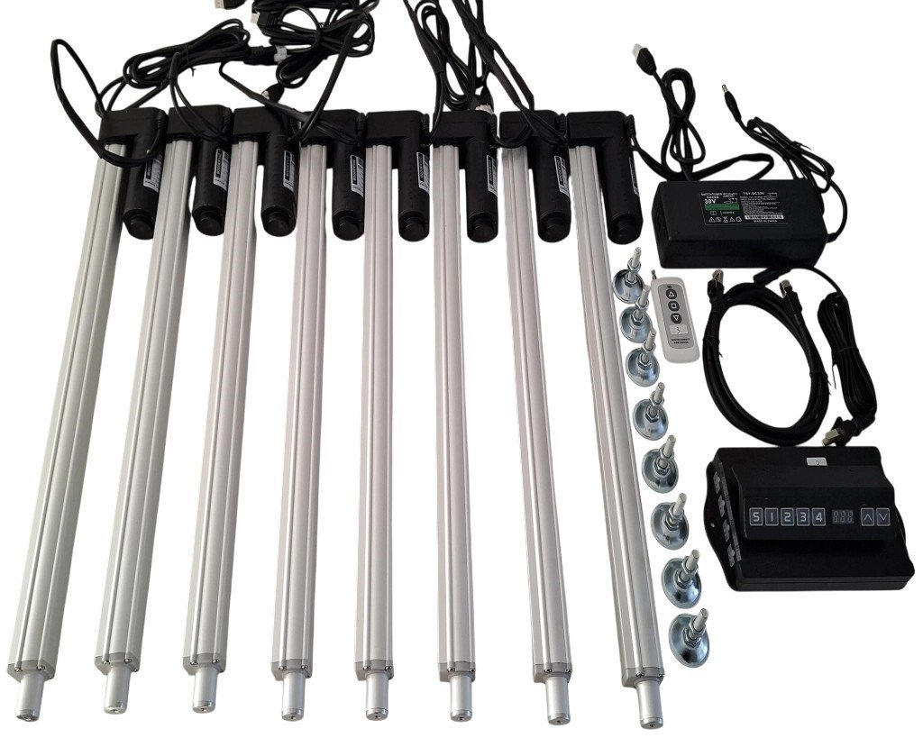 Elektrický lineární pohon napájený napětím 24V. Zvedací kapacita pohonu je 3000 N. Maximální výsuv zařízení je 45 cm. LEG_SET 8 obsahuje 8 nohou, ovládání, dálkové ovládání, napájení, stavěcí šrouby, napájecí kabely.