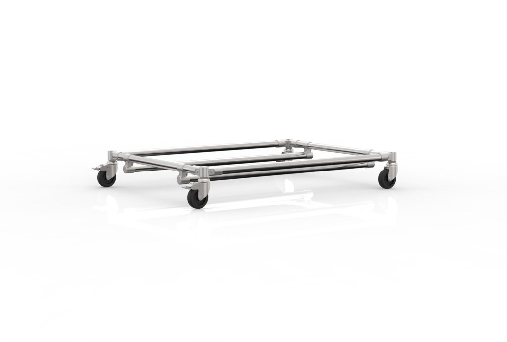 Manipulační podvozek vyrobený z trubkového systému je vhodný pro různé manipulační účely ve skladech i dílnách. Součástí podvozku jsou 2 otočná kolečka s brzdou a 2 otočná kolečka bez brzdy o průměru 75 mm, která umožňují snadnou manipulaci s předměty. Vnitřní rozměr je navržen pro 2 bedny o rozměrech 600 x 400 mm. Rozměry 878 x 678 x 138 mm.