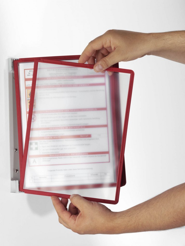 Nástěnný držák s 5ti prezentačními panely SHERPA® ve formátu A4 v různých barvách. Snadná manipulace i instalace.