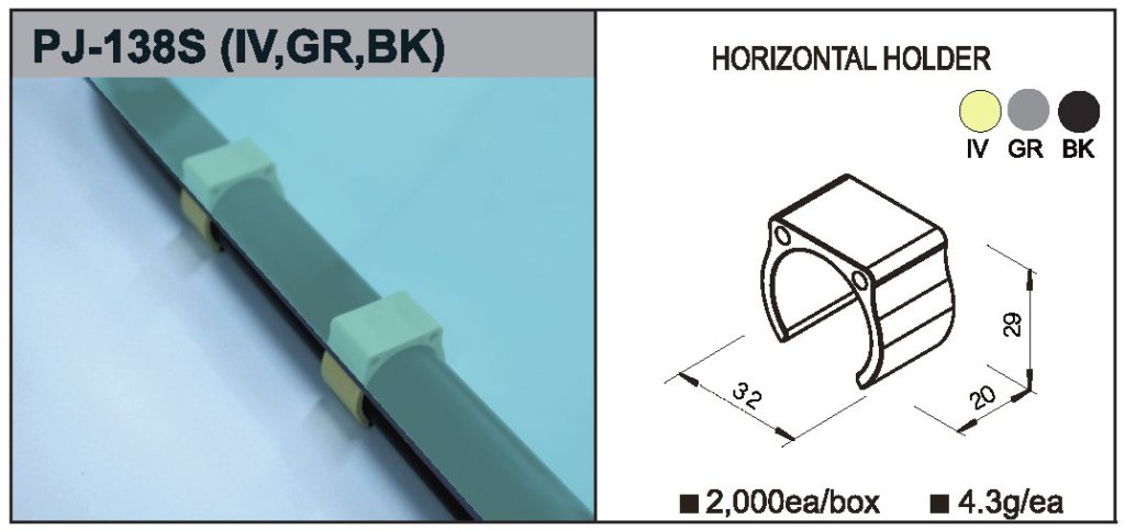 Plastová objímka typ PJ-138S, vhodná například jako podpěra pod polici. Barva béžová (IV), šedá (GR) nebo černá (BK), hmotnost 4,3 celý popis a parametry