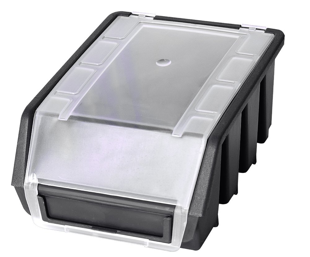 Plastové zásobníky Ergobox 2 Plus v černé barvě. Průhledné víko, prostor pro štítek. Vhodné k zavěšení na plastové nebo kovové celý popis a parametry
