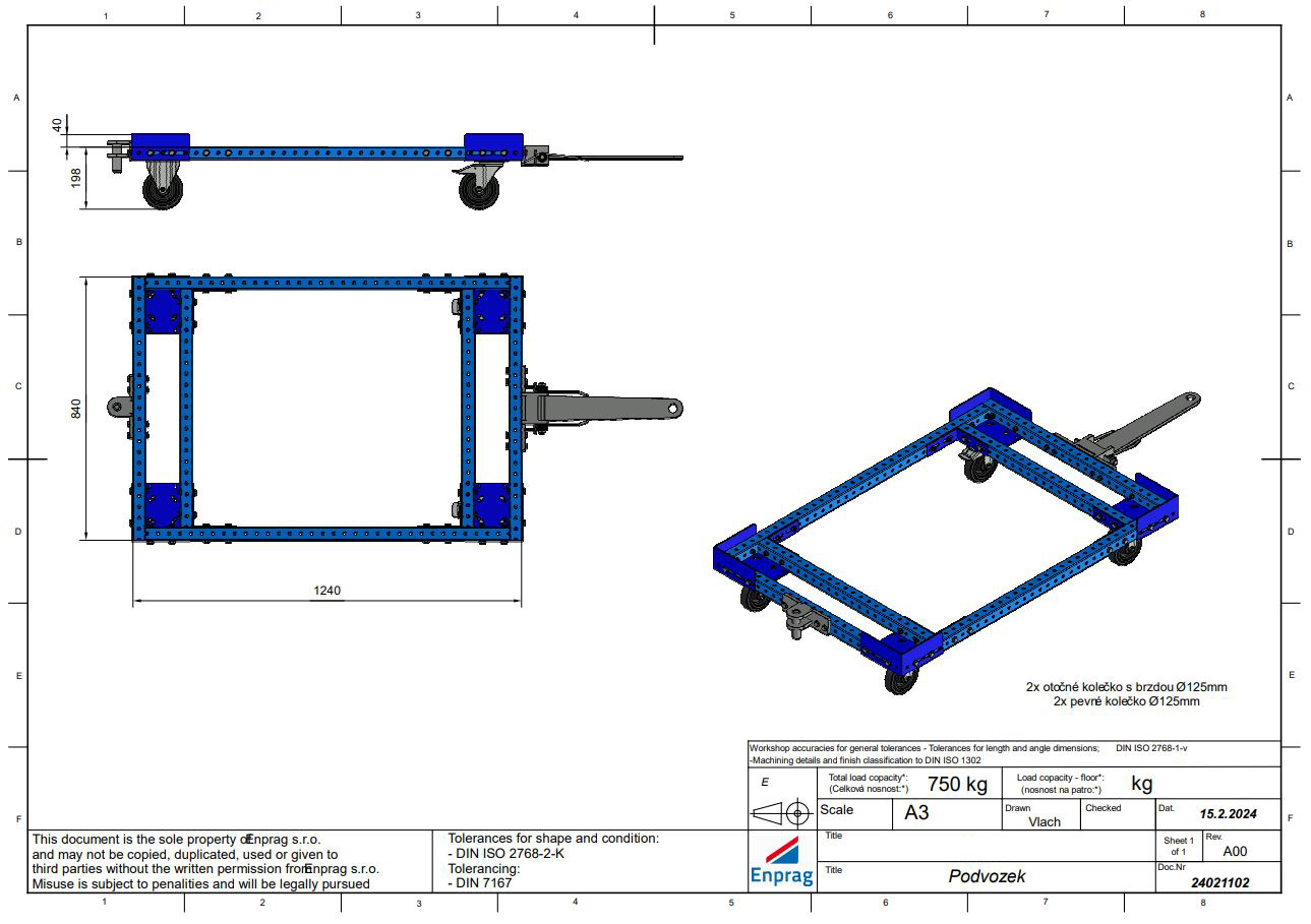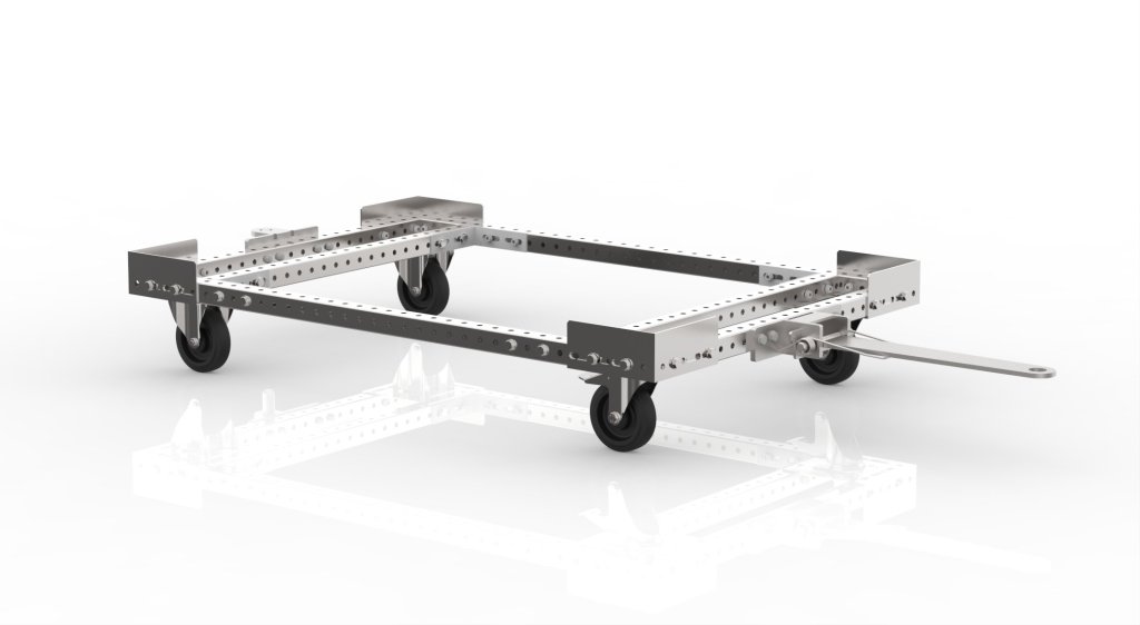 Manipulační podvozek na EURO paletu s ojí, která umožňuje zapojení více vozíků za sebe (tzv. Milk-run systém). Podvozek je vhodný pro různé manipulační účely ve skladech i dílnách. Díky své vysoké nosnosti 750 kg je ideální pro přepravu těžších předmětů. Součástí podvozku je 2x otočné kolečko s brzdou a 2x otočné kolečko bez brzdy o průměru 125 mm, které umožňují snadnou manipulaci s předměty. Rozměry podvozku 1240 x 840 x 238 mm. Možnost ESD varianty.