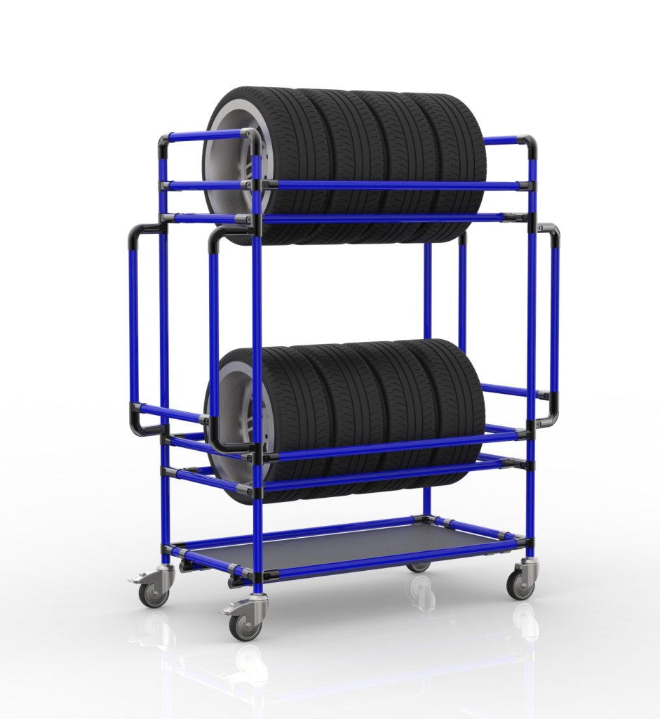 Pojízdný regál na pneumatiky z trubkového stavebnicového systému s jednou policí a dvěma patry. Ideální pro pneumatiky o rozměrech 16" až 20". Součástí stojanu jsou dvě patra pro uskladnění pneumatik, jedna police s akyboardem o tloušťce 10 mm, madlo na každé straně pro pohodlnější manipulaci, dvě kolečka s brzdou a dvě kolečka bez brzdy o průměru 100 mm. Pneumatiky nejsou součástí. Nosnost police 100 kg, celková nosnost 200 kg. Rozměry 1500 x 1068 x 600 mm.