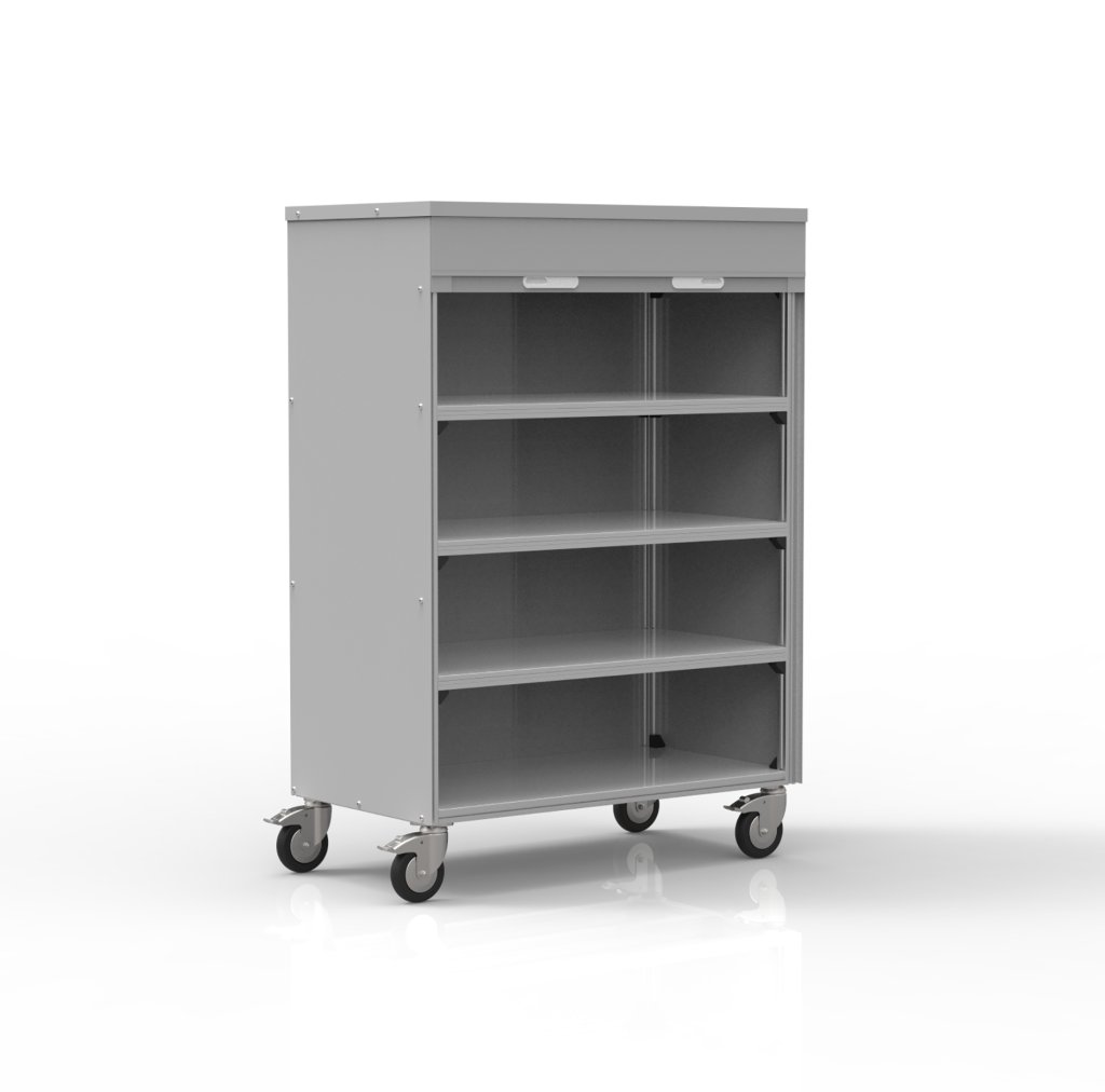 Policový vozík s roletou je vyroben z hliníkových profilů, což zaručuje nejen pevnost, ale také odolnost celé konstrukce. Součástí vozíku je roleta, tři police s lamino deskou tloušťky 18 mm, plastová madla pro snadnou manipulaci, boční a zadní strany jsou pokryty PET-G průhlednými deskami a čtyři otočná kolečka s brzdou o půrměru 100 mm. Nosnost vozíku 150 kg, nosnost patra 50 kg. Rozměry 1500 x 1250 x 640 mm.