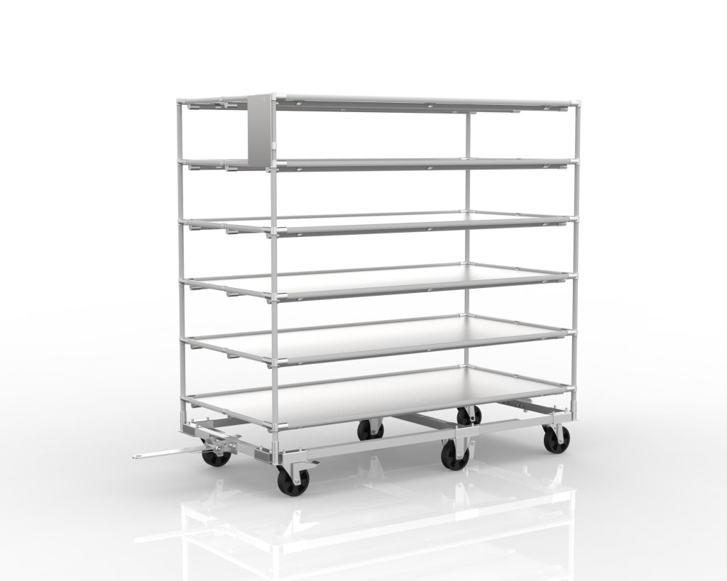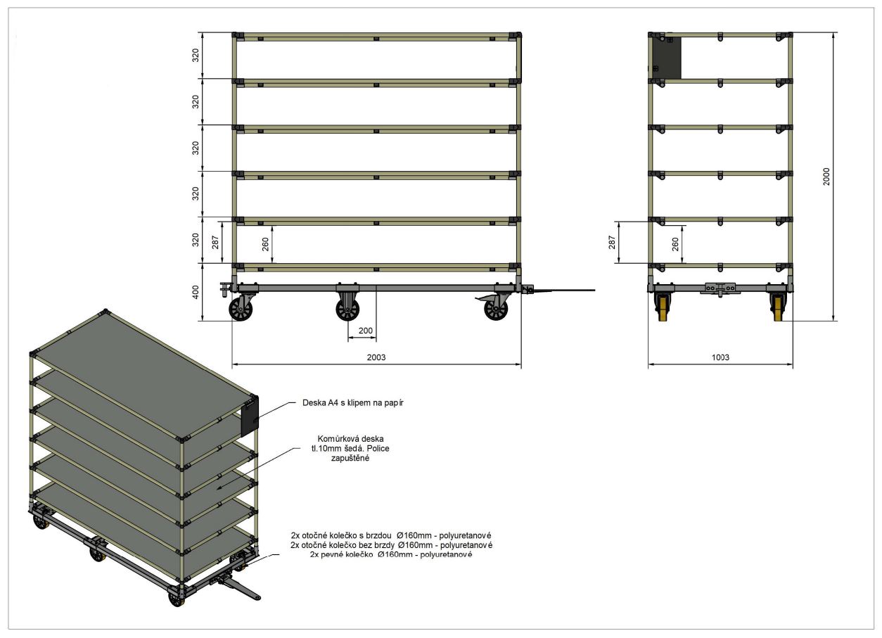 Policový vozík z jeklového podvozku s nástavbou z trubkového systému. Možnost zapojení více vozíků do vláčku. Vhodný pro přepravu materiálu a produktů.