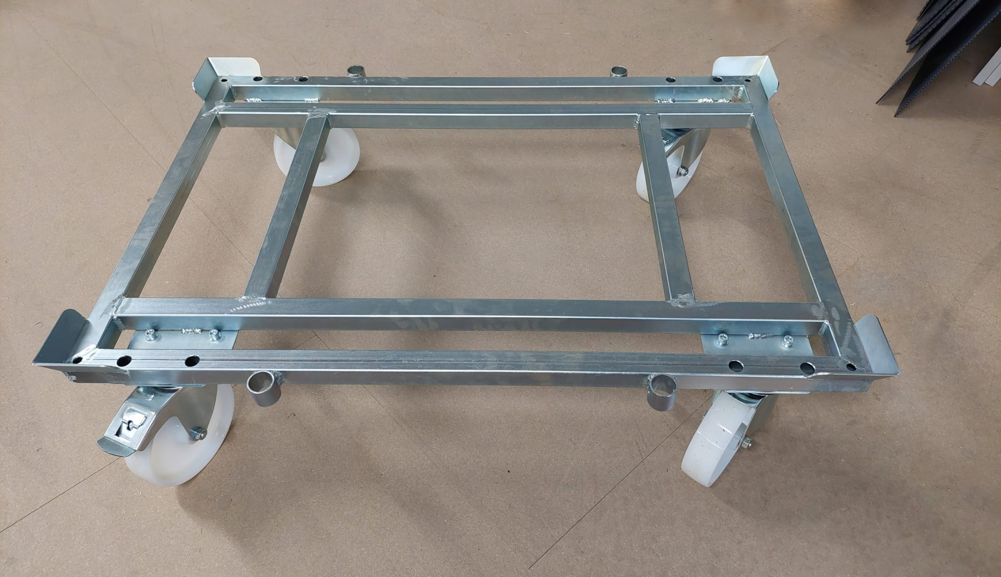 Svařovaný jeklový podvozek, vhodný pro různé manipulační účely ve skladech i dílnách. Díky své vysoké nosnosti 500 kg je ideální pro přepravu těžších předmětů. Součástí podvozku je 2x otočné kolečko s brzdou a 2x otočné kolečko bez brzdy z polypropylenu o průměru 200 mm. Rozměry podvozku 282 x 1240 x 900 mm.