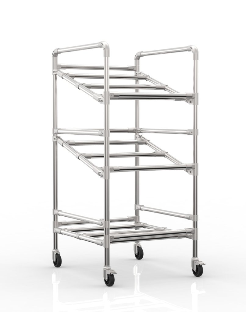 Regálový vozík na přepravky s jednou rovnou a dvěma šikmými policemi je praktickým pomocníkem pro manipulaci ve výrobních firmách a logistických centrech, zejména v oblasti e-commerce. Součástí vozíku jsou dvě otočná kolečka s brzdou o průměru 75 mm a dvě otočná kolečka bez brzdy. Předností těchto koleček je nízký valivý odpor, a díky tomu komfortní manipulace. Konfiguraci koleček je možné změnit dle požadavků zákazníka. Celková nosnost je 180 kg, nosnost na polici 60 kg. Rozměry jsou 1250 x 572 x 670 mm.