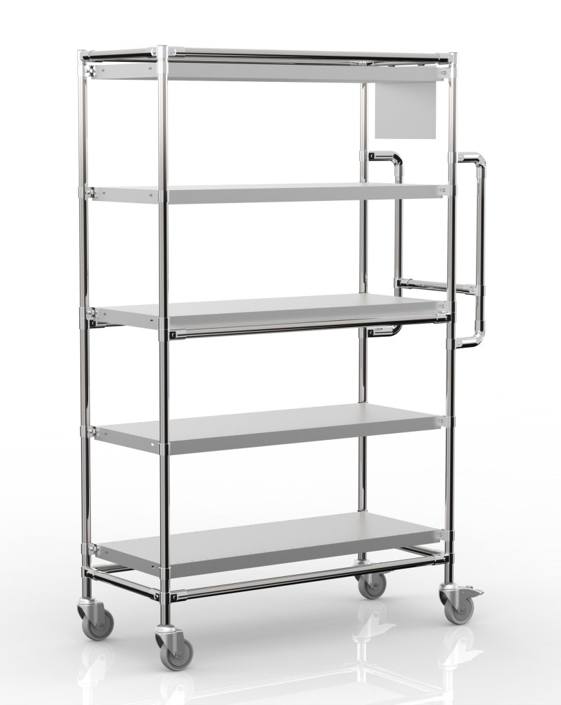 Součástí vozíku jsou dvě otočná kolečka s brzdou a dvě otočná kolečka bez brzdy o průměru 100 mm. Předností těchto koleček je nízký valivý odpor a díku tomu komfortní manipulace. Konfiguraci koleček je možné změnit dle požadavků zákazníka. Vozík je také vybaven ergonomickou rukojetí pro snadnější a komfortnější manipulaci. Celková nosnost 300 kg, nosnost na polici 60 kg. Rozměry 1765 x 1066 x 482 mm.