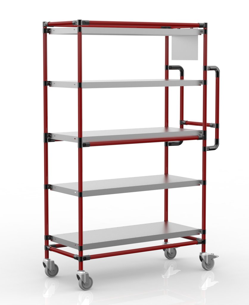 Regálový vozík na přepravky s pěti rovnými policemi je praktickým pomocníkem pro manipulaci ve výrobních firmách a logistických centrech.