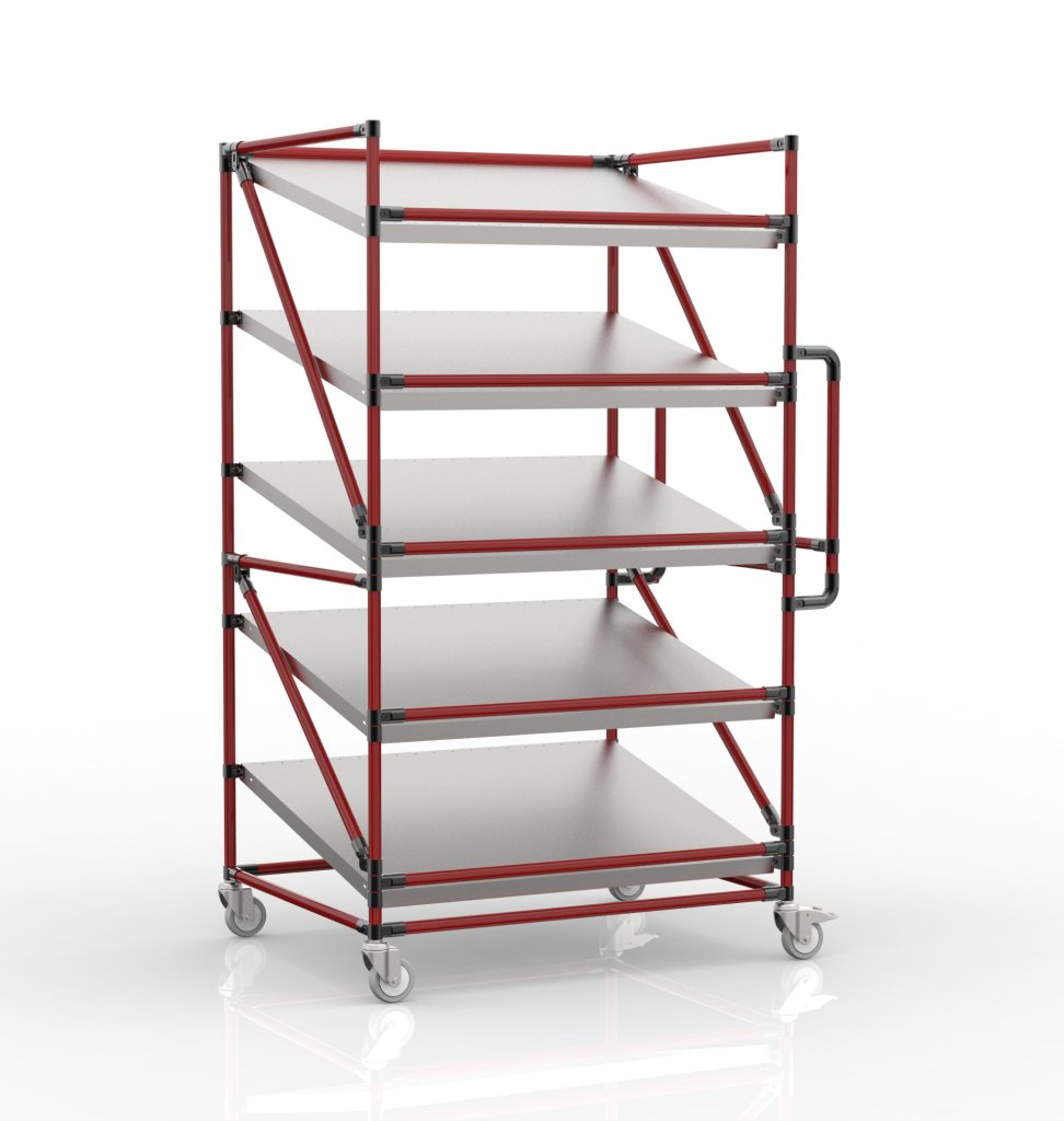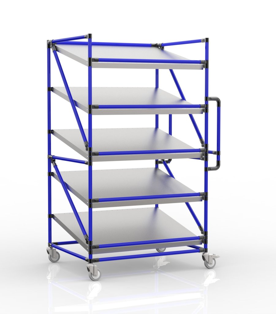 Regálový vozík na přepravky s pěti šikmými policemi je praktickým pomocníkem pro manipulaci ve výrobních firmách a logistických centrech.