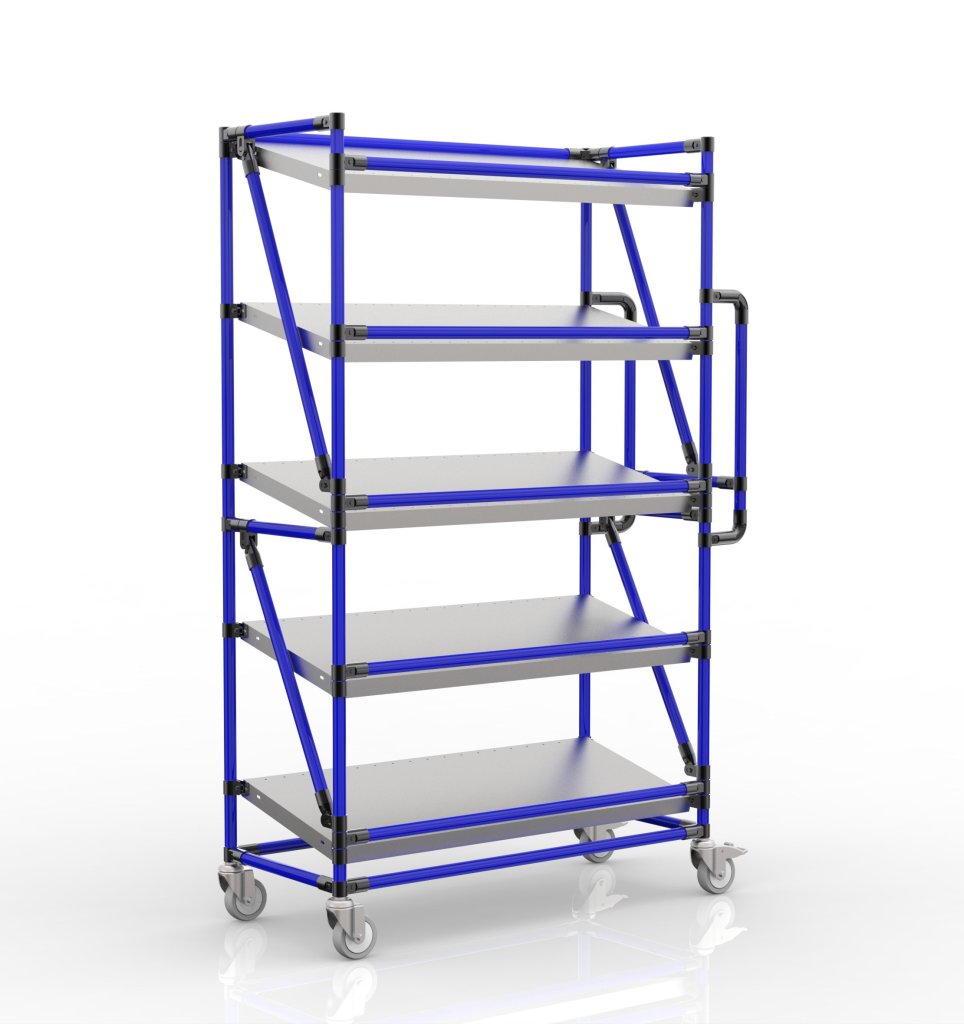 Regálový vozík na přepravky s pěti šikmými policemi je praktickým pomocníkem pro manipulaci ve výrobních firmách a logistických centrech.