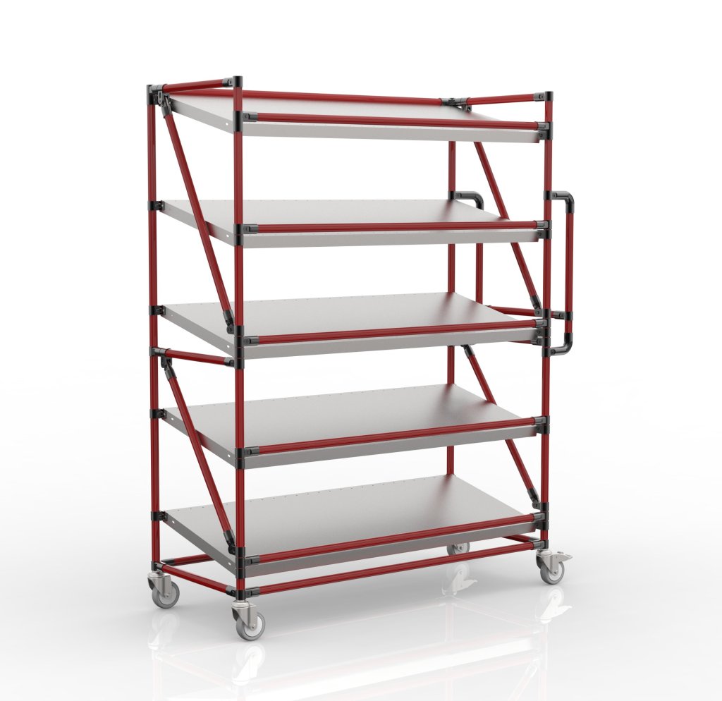 Regálový vozík na přepravky s pěti šikmými policemi je praktickým pomocníkem pro manipulaci ve výrobních firmách a logistických centrech.