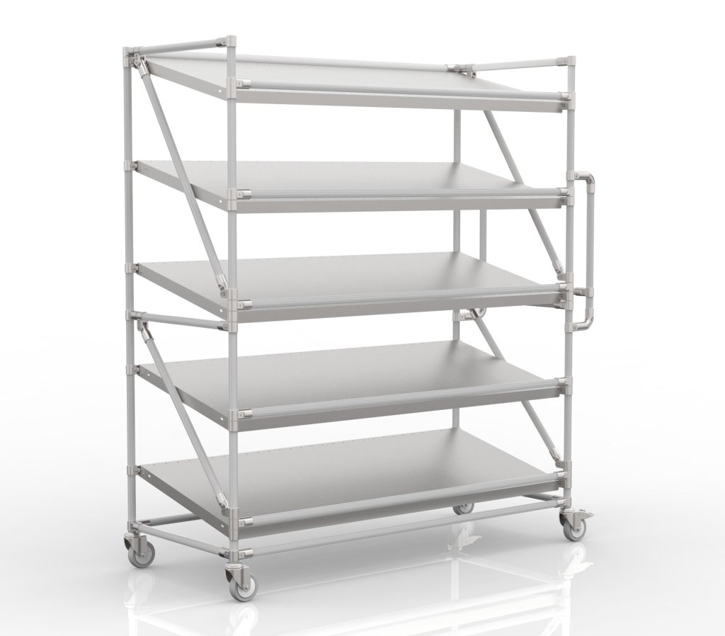 Regálový vozík na přepravky s pěti šikmými policemi je praktickým pomocníkem pro manipulaci ve výrobních firmách a logistických celý popis a parametry