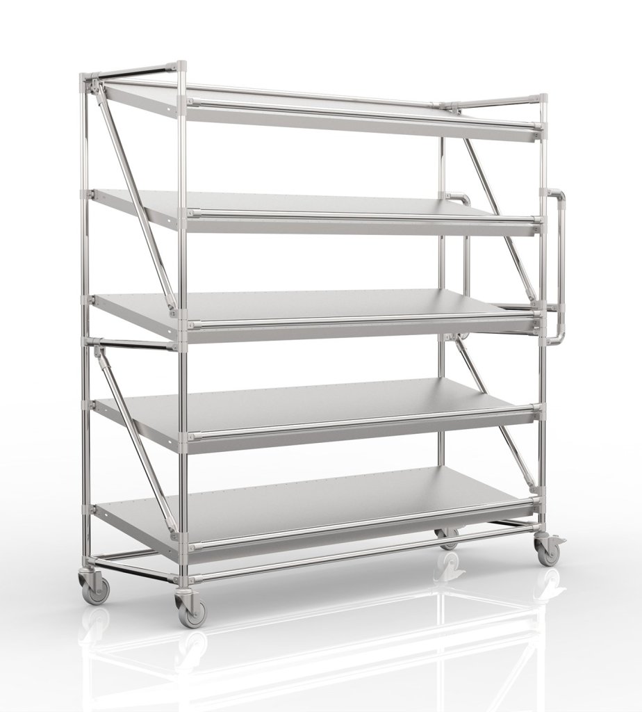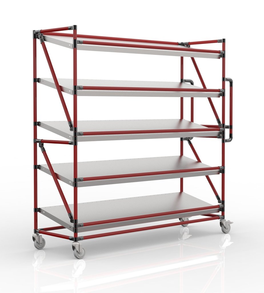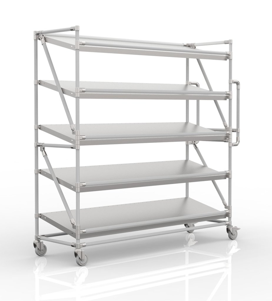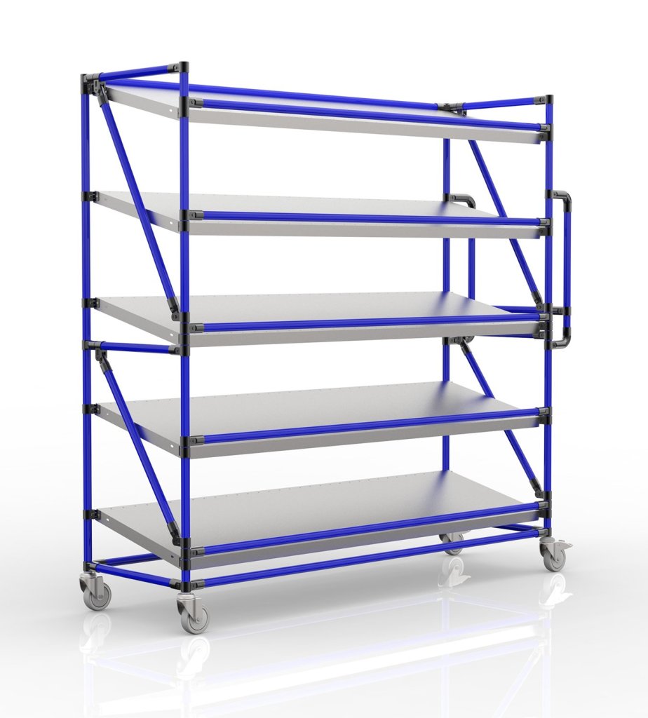 Regálový vozík na přepravky s pěti šikmými policemi je praktickým pomocníkem pro manipulaci ve výrobních firmách a logistických centrech, zejména v oblasti e-commerce. Součástí vozíku jsou dvě otočná kolečka s brzdou a dvě otočná kolečka bez brzdy o průměru 100 mm. Předností těchto koleček je nízký valivý odpor a díku tomu komfortní manipulace. Konfiguraci koleček je možné změnit dle požadavků zákazníka. Vozík je také vybaven ergonomickou rukojetí pro snadnější a komfortnější manipulaci. Celková nosnost 300 kg, nosnost na polici 60 kg. Rozměry 1782 x 1766 x 472 mm.