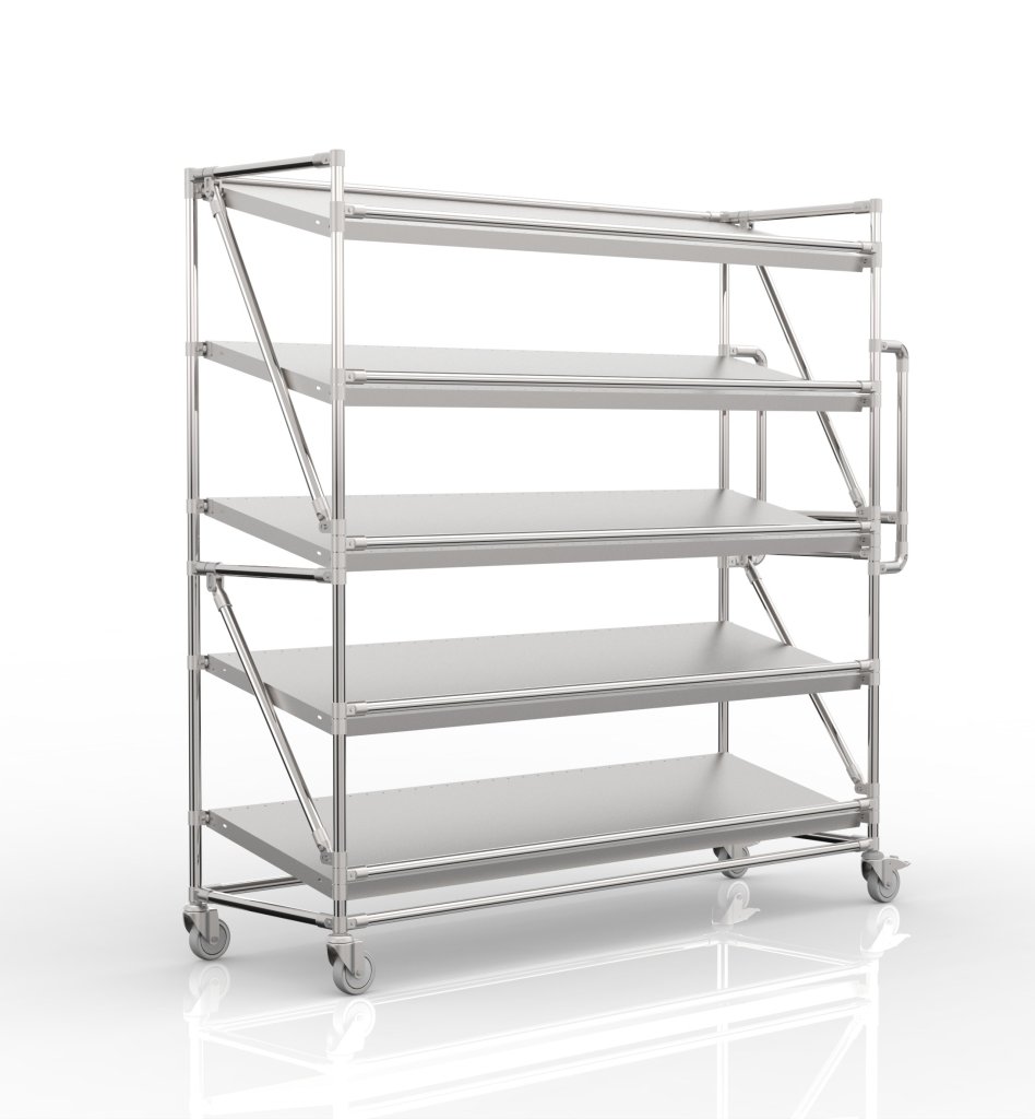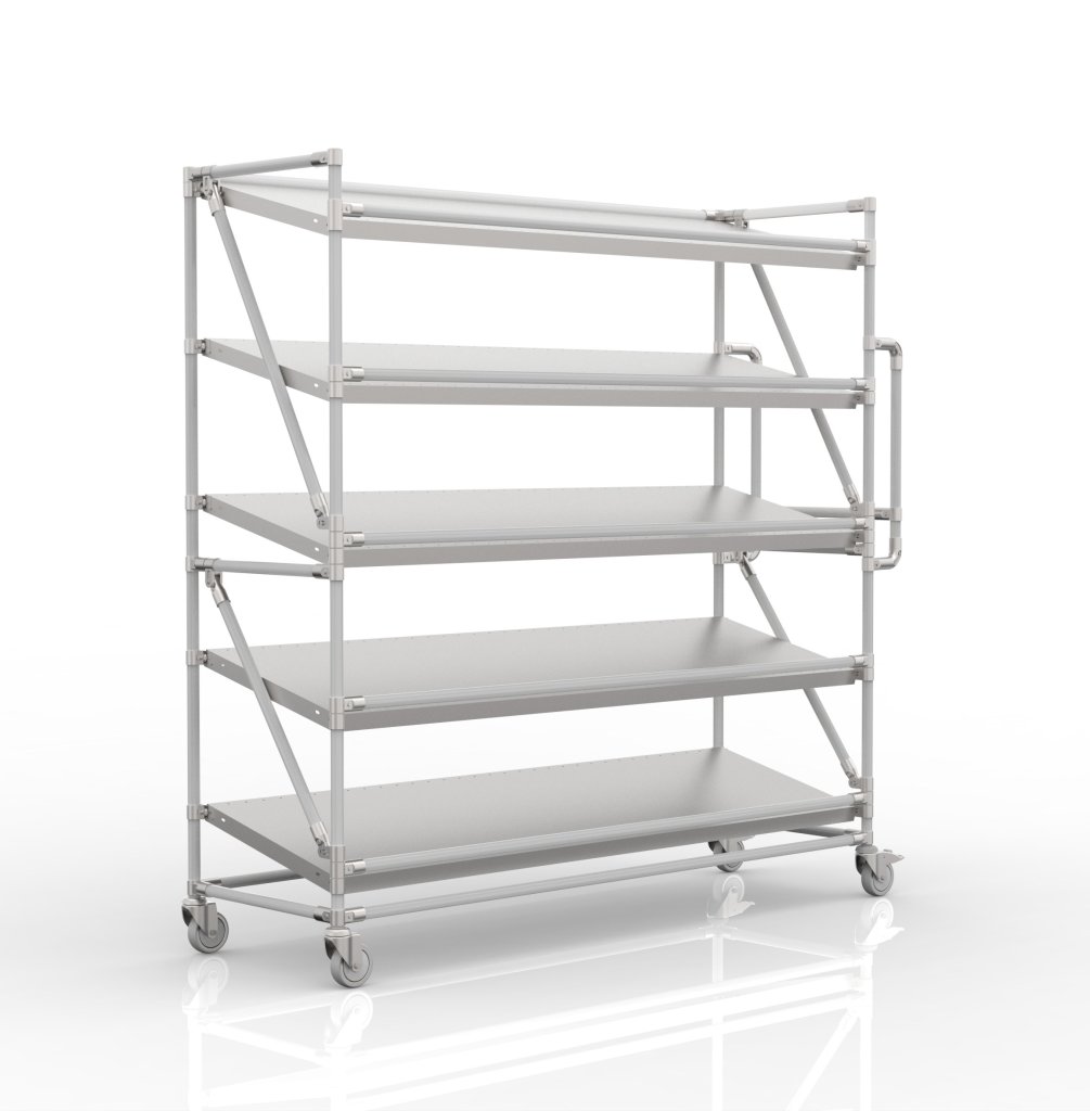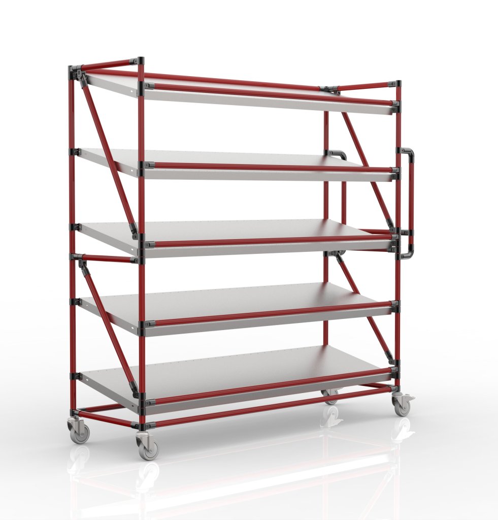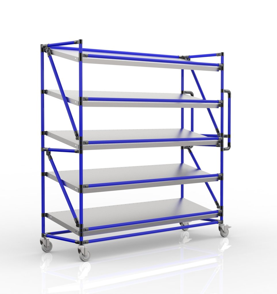 Regálový vozík na přepravky s pěti šikmými policemi je praktickým pomocníkem pro manipulaci ve výrobních firmách a logistických centrech, zejména v oblasti e-commerce.