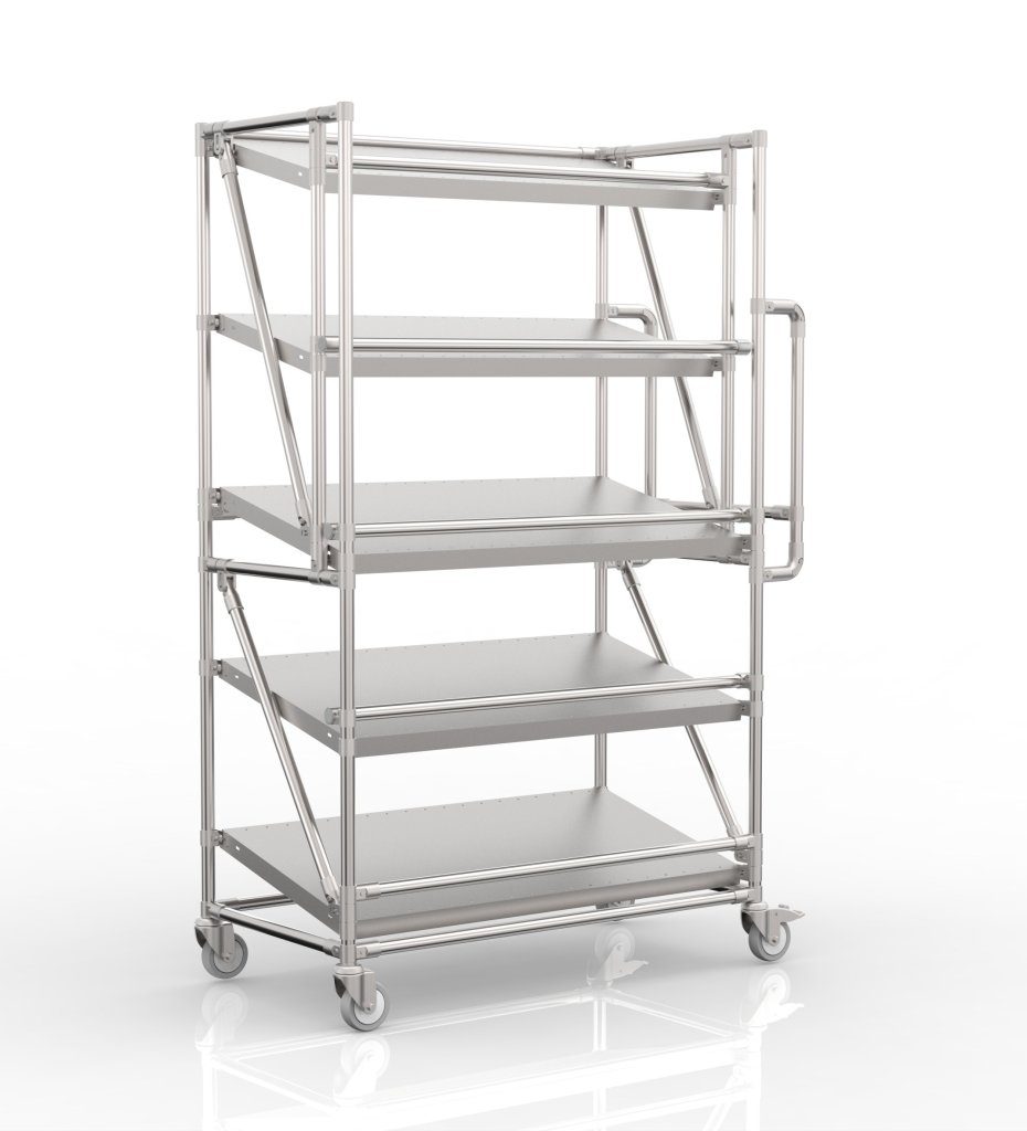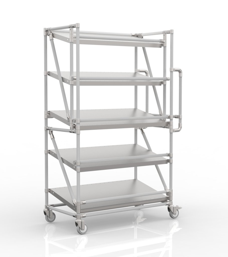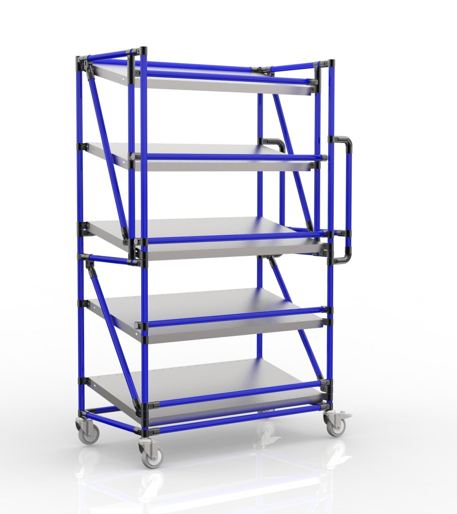Regálový vozík na přepravky s pěti šikmými policemi je praktickým pomocníkem pro manipulaci ve výrobních firmách a logistických centrech. Součástí vozíku jsou dvě otočná kolečka s brzdou a dvě otočná kolečka bez brzdy o průměru 100 mm. Předností těchto koleček je nízký valivý odpor a díku tomu komfortní manipulace. Konfiguraci koleček je možné změnit dle požadavků zákazníka. Vozík je také vybaven ergonomickou rukojetí pro snadnější a komfortnější manipulaci. Celková nosnost 300 kg, nosnost na polici 60 kg. Rozměry 1770 x 1059 x 567 mm.