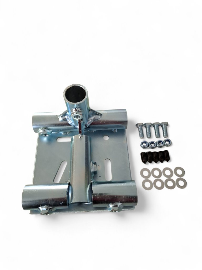Rohový spojovací držák trubek s otvory pro upevnění koleček s plotnou. Barva stříbrná. celý popis a parametry