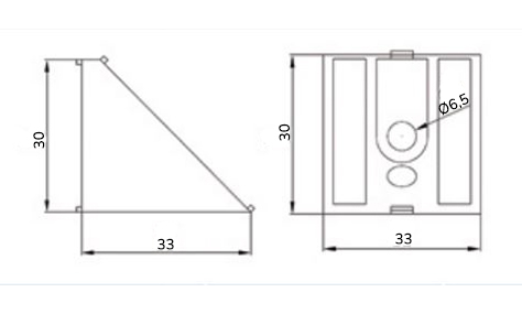 Úhelník s úhlem 45° pro spojování profilů. Rozměry 30 x 33 x 33 mm.