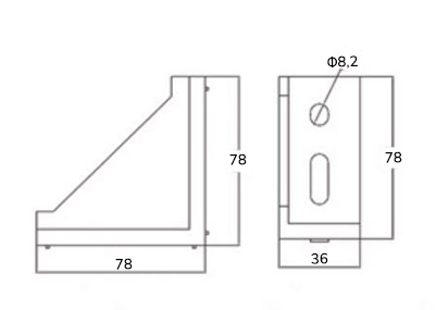Úhelník s úhlem 90° pro spojování profilů. Boční vzpěra zajišťuje vysokou pevnost spoje. Tloušťka stěny je 6,5 mm, tloušťka zavětrování 3,5mm. Rozměry 78 x 36 x 78 mm.