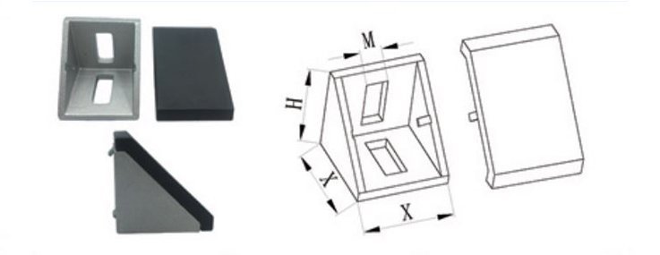 Úhelník s úhlem 90° pro spojování profilů, s krytkou. Rozměry 38 x 38 x 38 mm. Spojovací materiál není součástí balení.
