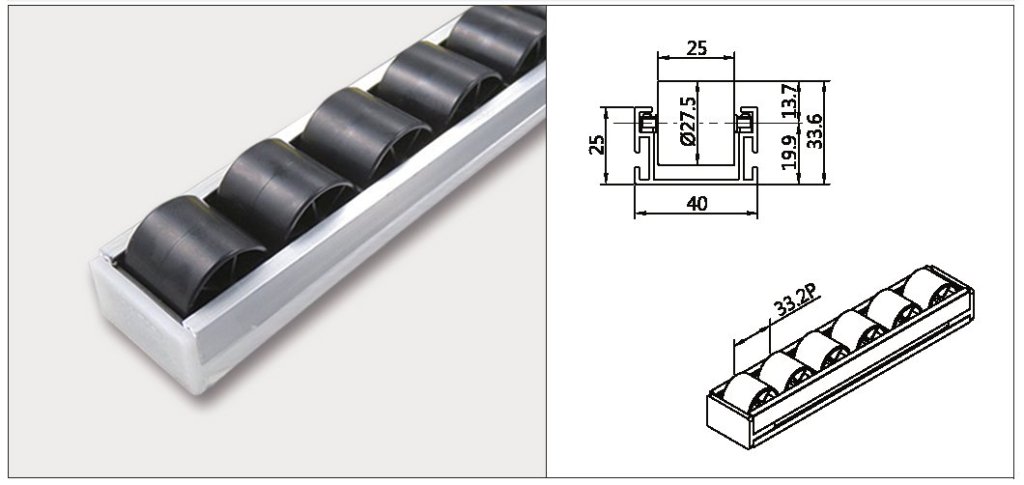 Válečková dráha šířky 40 mm, celková délka 4000 mm. Hliníkové tělo, průměr válečků 27,5 mm, antistatické provedení ESD. celý popis a parametry