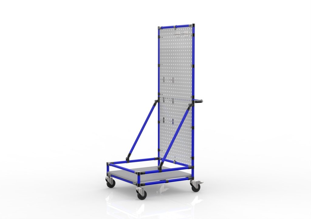 Vozík na úklid pro dodržení metodiky 5S. Vhodný pro organizaci a úklid na pracovišti. Součástí je perfopanel s 10 háčky a lamino deskou tloušťky 18 mm. Konstrukce tvořená trubkami LP-1100, modrá. Spojky ošetřeny černým práškovým lakem.