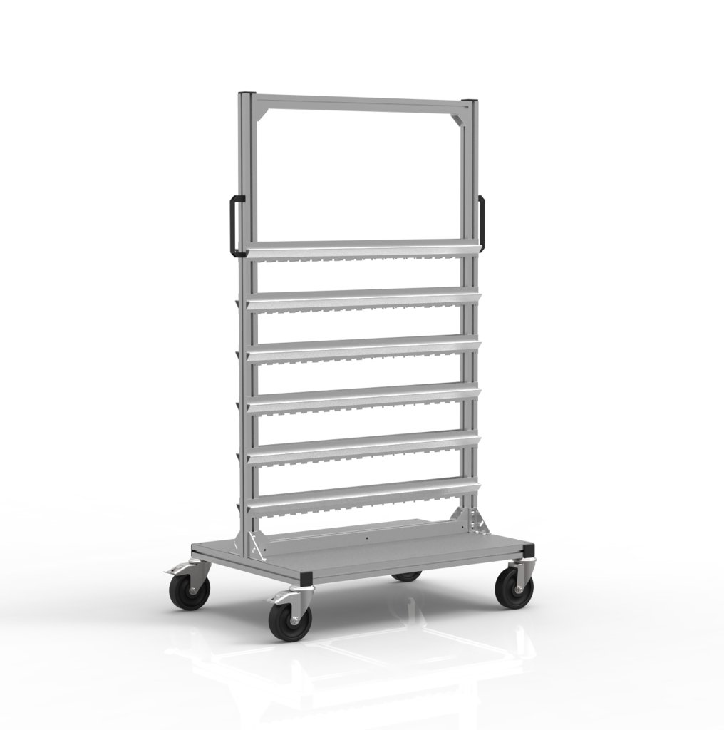 Vozík na zavěšení KLT boxů je praktický pomocník pro manipulaci s přepravkami a materiály v průmyslových prostředích. Vozík je vyroben z hliníkových profilů, což zaručuje nejen pevnost, ale také odolnost celé konstrukce. Součástí je také ergonomické černé madlo, které zajišťuje pohodlnou manipulaci a snadné ovládání vozíku. Vozík je vybaven 2 otočnými koly s brzdou o průměru 125 mm a 2 otočnými koly bez brzdy o průměrů 125 mm. Nosnost 400 kg. Rozměry 1550 x 855 x 600 mm.