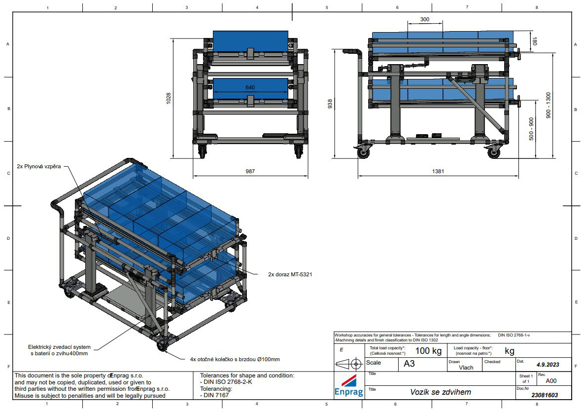 Manipulační vozík s elektrickým zvedacím systémem a baterií je vhodným doplňkem do všech průmyslových a skladovacích prostor. Robustní konstrukce a spolehlivý zvedací systém umožňují snadný a bezpečný transport nákladu o hmotnosti až 100 kg a s možností zdvihu až 400 mm. S výdrží baterie až 3 hodiny funkčního času je manipulační vozík spolehlivým pomocníkem během celé pracovní směny. Rozměry 1028 x 1381 x 987 mm.